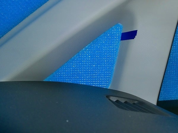 この折りたたみ式断熱日よけは、フロントウインドー用(補助日よけ1面、同スペーサー1個を含む)2面と1個、ファーストウインドー用(運転席側窓用1面と助手席側窓用1面、デルタウインド用左右2面)4面、セカンドウインドー用(運転席側後部窓用1面と助手席側後部窓用1面)2面、サードウインドー左右2面、リアウインドー用Ⅰ面、サンルーフ用を除く全11面と1個がワンセットとなっております。